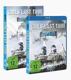 Universum Anime veröffentlicht die zwölf Folgen von GIRLS' LAST TOUR auf drei DVD- und Blu-ray-Volumes: Volume 1 mit den Episoden 1 bis 4 ist ab dem 30. November 2018 erhältlich, Volume 2 folgt bereits im Dezember. Als Extras führt Volume 1 japanische Original-Trailer sowie textlose Versionen der Opening- und Ending Songs Ugoku, ugoku und More One Night mit sich. Letzere wurden von Inori Minase und Yurika Kubo eingesungen, den japanischen Stimmen von Chito und Yuuri, die hiesigen Anime-Fans beispielsweise auch als Hestia und Loki aus der Fantasy-Serie DANMACHI - IS IT WRONG TO TRY TO PICK UP GIRLS IN A DUNGEON? bekannt sind. Auf Deutsch schlüpfen Leonie Landa (u. a. Lotta Otus in ACCA: 13-TERRITORY INSPECTION DEPT.) und Katrin Heß (u. a. Hestia in DANMACHI) in die Rollen des dynamischen Protagonistinnen-Duos.