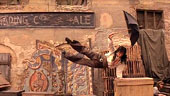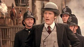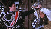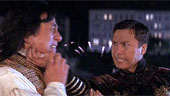 | FILMREZENSION VON JOST RENNEBAUM | | "Shanghai Knights" ist wirklich ein kurzweiliges Vergnügen und bietet eine gute Mischung aus Action und Komödie. Der Film nimmt sich selber zum Glück nicht allzu ernst und bietet neben moderner Musik während diverser Actionszenen zahlreiche Hommages an Film-Klassiker wie z. B. "Singin' In The Rain". Selbst die Endszene, die sich auf dem Big Ben abspielt erinnert stark an die Szene in der Turmuhr in "Project A". Ganz nett, wenn auch etwas weit hergeholt ist die Einbeziehung von historischen Figuren wie Sir Arthur Conan Doyle, der Autor der Sherlock Holmes Romane, der natürlich von dem Duo O'Bannon und Wong dazu inspiriert wurde, oder Charlie Chaplin, der unseren Helden tatkräftig zur Seite steht. Ganz nebenbei wird auch noch Jack The Ripper durch die schlagkräftige Fann Wong, die im Film die Schwester von Chon Wang spielt, beseitigt. Die Actionszenen, die grösstenteils von Jackie in Zusammenarbeit mit seinem Stuntteam-Mitglied Brad Allen (der auch den Fightpartner in Gorgeous spielte) choreographiert wurden sind wieder recht innovativ und zeigen z. B. eine Kampfszene, die sich mit drei Personen komplett in einer Drehtür abspielt. Die für jeden Hong Kong Film Fan wohl interessanteste Kampfszene ist die zwischen Jackie Chan und Donnie Yen, die zum Glück bis auf ein, zwei offensichtliche Moves ohne Drahtseile ausgekommen ist. Für meinen Geschmack hätte sie ruhig noch etwas länger sein können und dafür bei dem darauffolgenden Schwertkampf zwischen Jackie und dem Bösewicht Rathbone gespart werden können. Aber da es sich hier um eine US-Produktion handelt ist dies verzeihlich, und trotzdem scheint "Shanghai Knights" wirklich der US-Film zu sein, in dem Jackie in den Actionszenen freie Hand gelassen wurde. |  |
