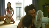 "The Strange Saga of Hiroshi the Freeloading Sex Machine" ist der nunmehr achte Film des Regisseurs Yûji Tajiri. Während Tajiri sich in seinen bisherigen Filmen eher ernsteren Thematiken als Rahmenhandlung widmete, setzt er hier voll und ganz auf Comedy. Die vollkommen absurde und minimalistisch gehaltene Story ist hier sowieso nur schmückendes Beiwerk, im Mittelpunkt stehen die Sexszenen, die Tajiri etwa im Fünf-Minuten-Takt auf den Zuschauer loslässt. Obwohl der Film nur eine Laufzeit von etwa einer Stunde hat, wirken diese Szenen bald zunehmend langweilig. Wenn Hiroshi erstmal in Fahrt kommt, fangen die Wände an zu wackeln wie bei einem Tokyoter Erdbeben... ein Gag, den man schon hundert mal gesehen hat. Gags auf diesem Niveau gibt es unterdessen zuhauf. Da spritzt schon mal die Herrencremé aus zwei Metern Entfernung in das Gesicht der mit offenem Mund staunenden Dame, yummy. Seltsam auch, dass die Darsteller, obwohl die Handlung über mehrere Tage verteilt zu sein scheint, ständig in denselben Klamotten herumlaufen. Vermutlich handelt es sich hierbei um spezielle Quicky-Suits, aus denen sich die Schauspieler in sekundenschnelle pellen können. Sehr zum infantilen Humor trägt auch Hauptdarsteller Mutsuo Yoshioka bei, der beim Akt wirklich selten dämlich aus der nicht vorhandenen Wäsche schaut (erinnert ein wenig an Tim Allen mit eingeklemmten Nerv). Seine titelgebende Figur Hiroshi lässt sich in erster Linie als triebgesteuert und nicht besonders fit in der Birne bezeichnen. Zuweilen schafft er es aber dennoch, den liebenswerten Chaoten zu mimen. Die eigentliche Hauptfigur ist ohnehin Haruka, gespielt von der kühl aber sympathisch wirkenden Rinako Hirasawa. Yûji Tajiri stellt sie als starke Frau dar, die beim Sex oft dominant auftritt und sich die Männer, mit denen sie schläft, nach belieben aussucht. Hier zeigt sich anscheinend Tajiris ganz eigene Vorstellung von Emanzipation. Der Plot um die Grillen dient vor allem als Metapher um die Verhaltensweisen der Tierwelt auf die des Menschen zu projizieren. Alles in allem kann der an 7 Tagen für ein Budget von 4,5Mio. Yen gedrehte Film nur bedingt überzeugen. Es gibt einige augenzwinkernde, einige halbwegs komische und sogar wenige rührende Szenen in diesem Film. Für letztere sorgt vor allem der kleine Yoichiro, der stets zu seiner Mutter hält. Das reicht allerdings nicht wirklich für einen guten Film. Das die Optik etwas bieder daherkommt, die Bildmontagen einfach lächerlich sind und die musikalische Untermalung aus sich ständig wiederholenden Trommelrhythmen besteht, ist in Anbetracht des Budgets sicher zu verschmerzen. Das Problem ist eher, dass dieses Filmchen weder besonders komisch, noch besonders anregend ist. Was bleibt ist eine teilweise etwas peinliche Aneinanderreihung von Hoppelszenen kombiniert mit einer Rahmenhandlung die zunächst zwar bizarr wirkt, dann aber doch recht wenig hergibt. Genrefans, die von dem etwas besseren "The Glamorous Life of Sachiko Hanai" begeistert waren, könnte womöglich auch dieser Film aus den Schnellfickerschuhen hauen, alle anderen sollten einen Kauf lieber genau überdenken. |  |