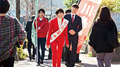 Besonders stechen hier die beiden Hauptfiguren, zum einen Privatsekretär Tsutomu, zum anderen die unfreiwillige Kandidatin Yumi hervor. Die Chemie zwischen den beiden ist grossartig und sicherlich gehören einige der Dialoge zwischen ihnen zum besten im ganzen Film! Leider kann "The Sunday Runoff" das hohe Niveau nicht den ganzen Film über tragen. Besonders zur Halbzeit gibt es mal einen ordentlichen Durchhänger, der für das grandiose Finale überwunden werden muss. |  |