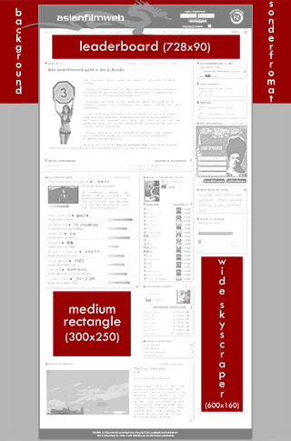 Links sehen Sie die Werbemöglichkeiten auf dem asianfilmweb. Alle gebuchten Banner sind prominent platziert, im Falle von Leaderboard und Background-Banner von jeder Seite aus sichtbar.