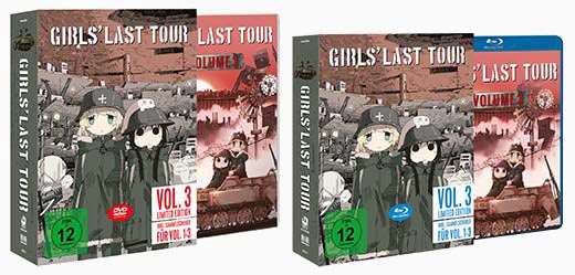 Universum Anime veröffentlicht die zwölf Folgen von GIRLS' LAST TOUR auf drei DVD- und Blu-ray-Volumes: Volume 1 mit den Episoden 1 bis 4 ist ab dem 30. November 2018 erhältlich, Volume 2 folgt bereits im Dezember. Als Extras führt Volume 1 japanische Original-Trailer sowie textlose Versionen der Opening- und Ending Songs Ugoku, ugoku und More One Night mit sich. Letzere wurden von Inori Minase und Yurika Kubo eingesungen, den japanischen Stimmen von Chito und Yuuri, die hiesigen Anime-Fans beispielsweise auch als Hestia und Loki aus der Fantasy-Serie DANMACHI - IS IT WRONG TO TRY TO PICK UP GIRLS IN A DUNGEON? bekannt sind. Auf Deutsch schlüpfen Leonie Landa (u. a. Lotta Otus in ACCA: 13-TERRITORY INSPECTION DEPT.) und Katrin Heß (u. a. Hestia in DANMACHI) in die Rollen des dynamischen Protagonistinnen-Duos.